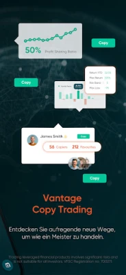 Die Vantage App besticht durch eine intuitiv gestaltete Oberfläche, die den Handel vereinfacht und gleichzeitig leistungsstarke Finanzanalysetools für Ihre fundierten Entscheidungen bereitstellt. Erweitern Sie Ihren Horizont, indem Sie die Portfolios und bewährten Strategien erfolgreicher Trader weltweit erkunden. Mit tausenden handelbaren Instrumenten und einer beeindruckenden Auswahl an Signalanbietern finden Sie garantiert die passende Inspiration für Ihren Weg zum Erfolg. Neulinge und Profis gleichermaßen profitieren vom kostenlosen $100.000 Demokonto – perfekt, um risikofrei zu üben und Vertrauen aufzubauen, bevor Sie zum Live-Handel wechseln.