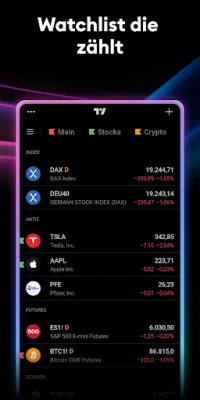 Mit TradingView behalten Sie dank individualisierbarer Watchlists und intelligenter Alarme stets den Überblick über Ihre bevorzugten Finanzinstrumente. Verfolgen Sie globale Indizes, Aktien, Währungspaare, Rohstoffe und Kryptowährungen in Echtzeit. Die flexiblen Alarmfunktionen stellen sicher, dass Ihnen keine entscheidende Marktbewegung entgeht, sodass Sie prompt auf Chancen reagieren und Ihre Handelsentscheidungen optimieren können. Und das Beste: Alle Ihre persönlichen Einstellungen, angelegten Charts und technischen Analysen werden nahtlos zwischen Ihrer App und der TradingView-Plattform synchronisiert, wodurch Sie jederzeit und überall produktiv bleiben.